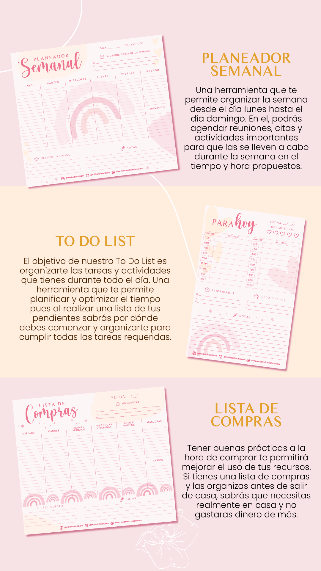 Un kit diseñado para planificar, facilitar y controlar tu día, semana y compras, con el fin de aumentar tu productividad y que sepas cuáles son tus prioridades.
